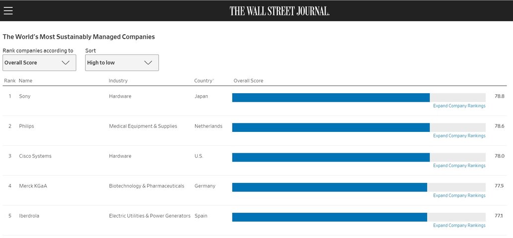 WSJの環境、ソーシャル、ガバナンス(企業統治)調査アナリストが5500社以上の上場企業を評価し、作成したランキングには、各分野の査定基準に従いながら、持続可能性を幅広い見地で捉え、WSJは「リーダーシップやガバナンス慣行を基に長期的な株主価値の創造能力を採点した」としています。